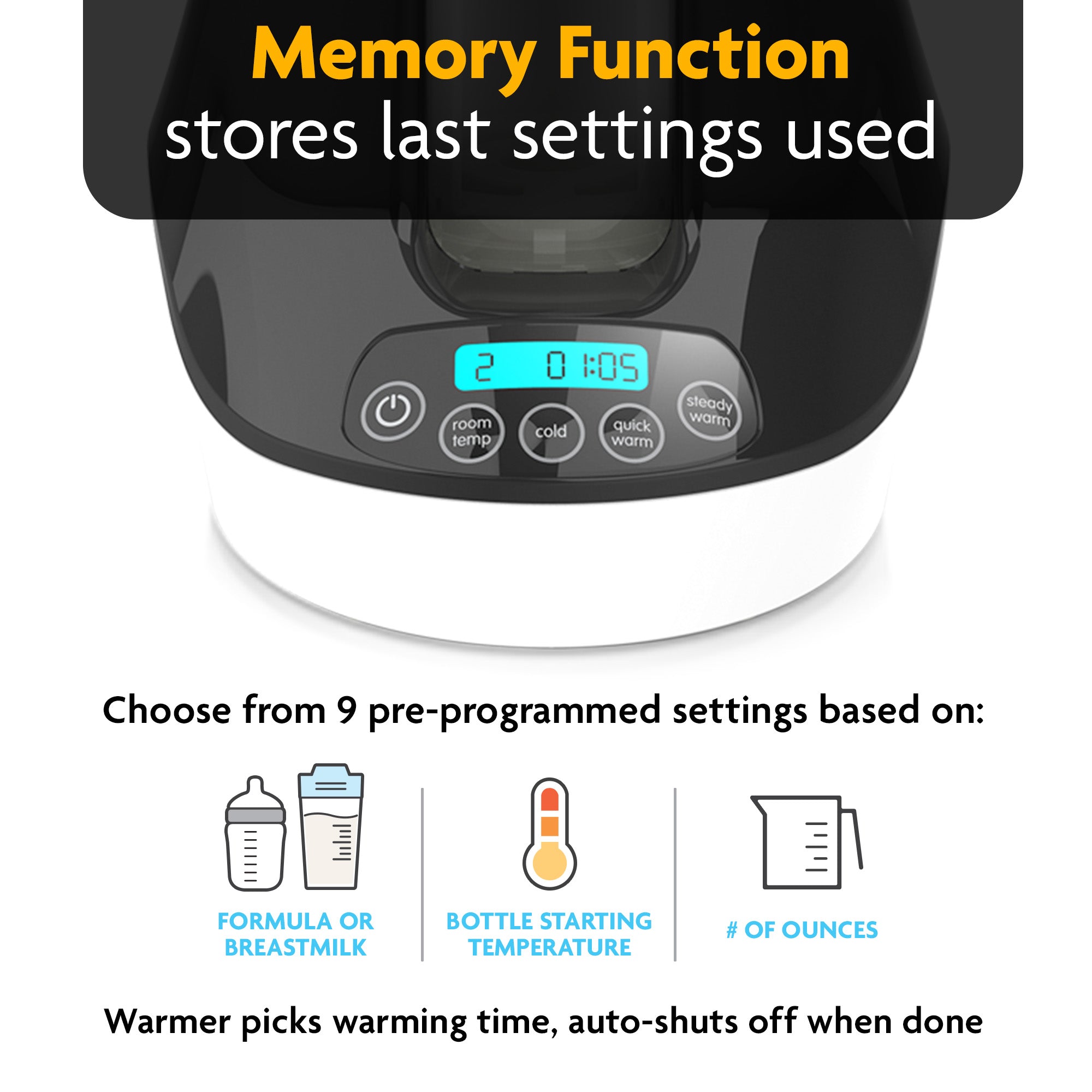 • More precise than other warmers – Choose from 9 pre-programmed settings based on number of oz. starting temps. and bottle material; auto shut-off when finished