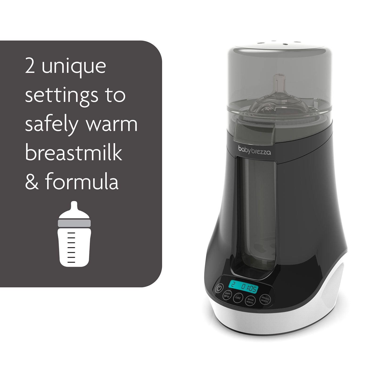 • Steam Heat – Rapidly and safely warms formula or baby food in as little as 2 minutes